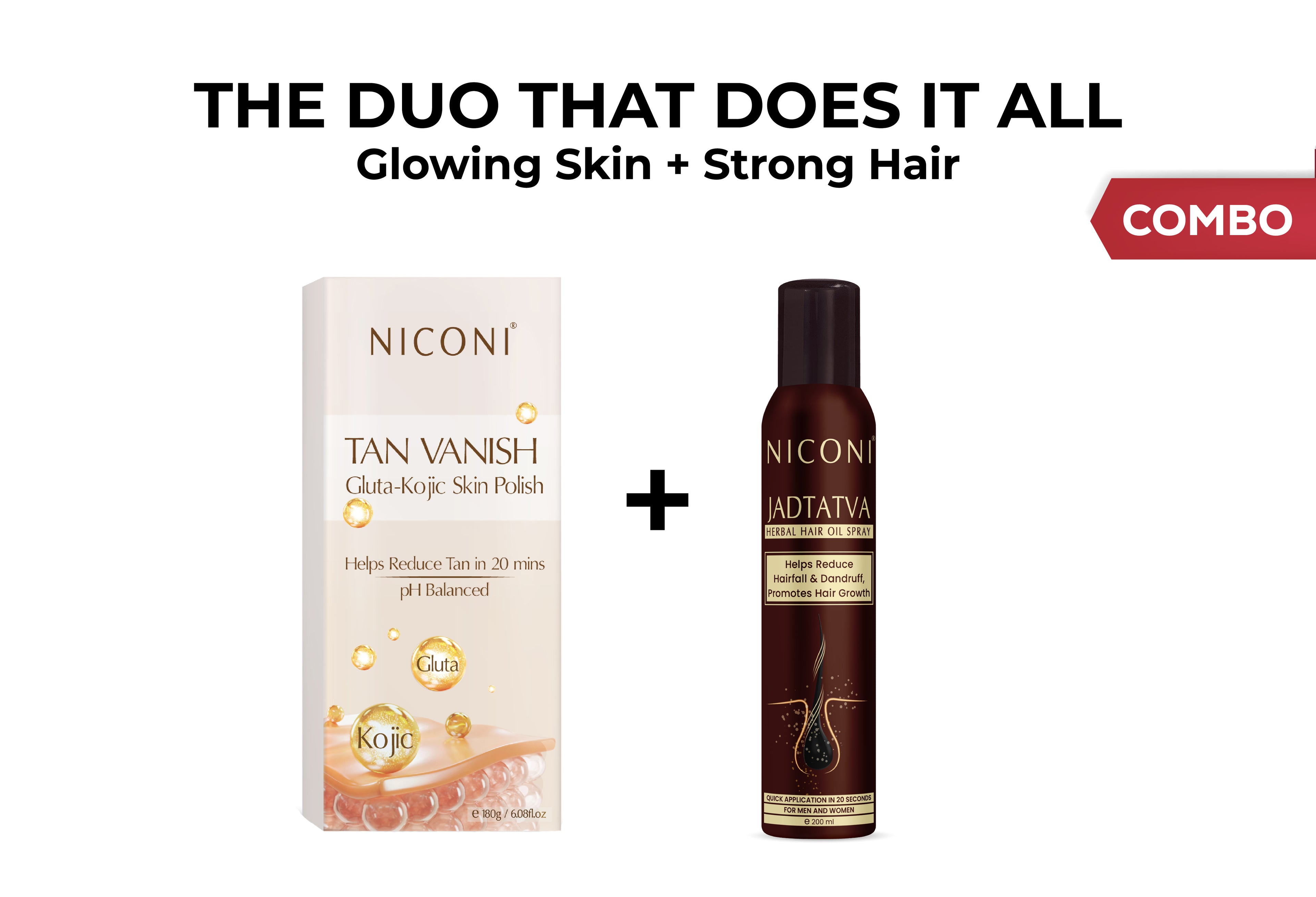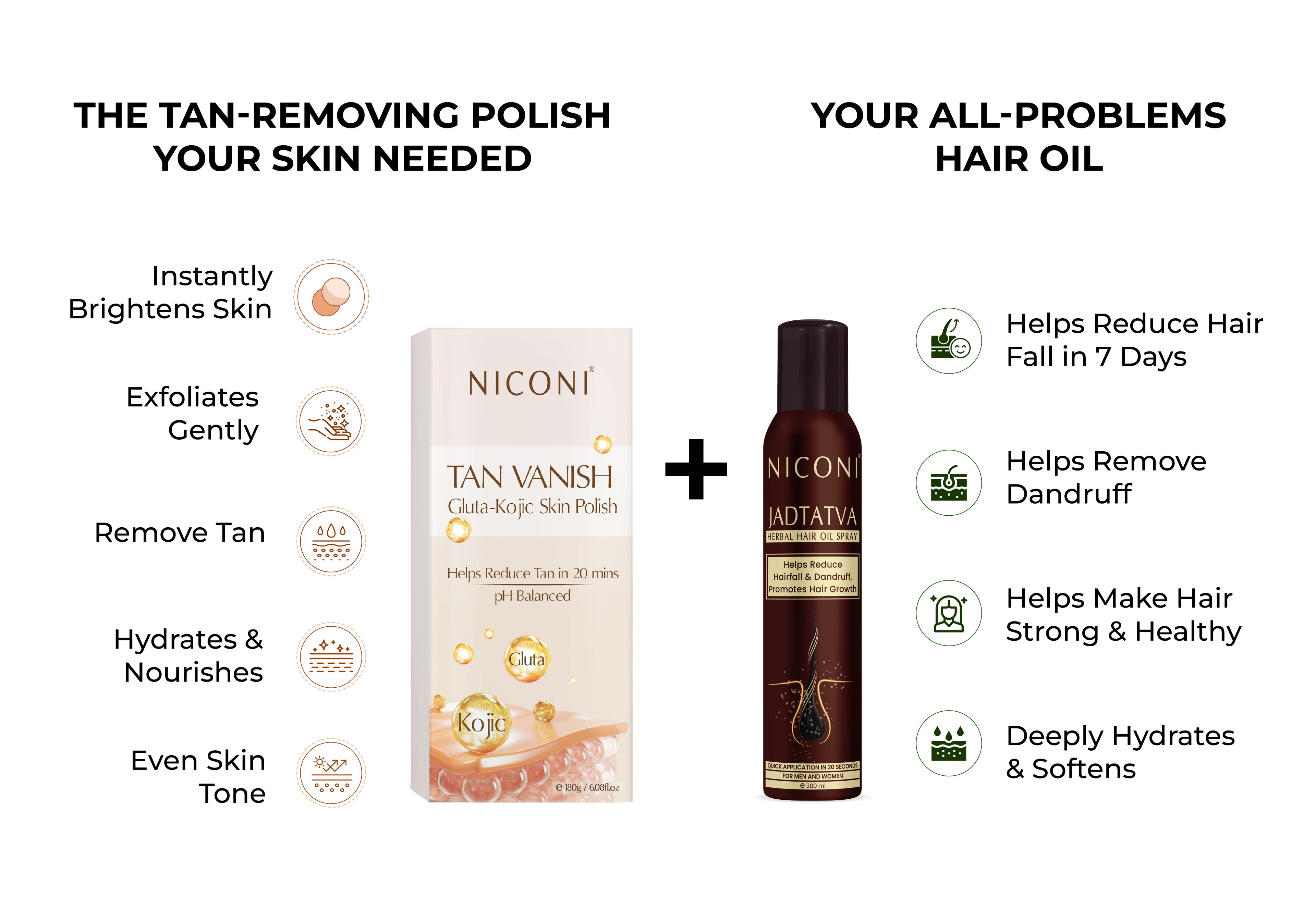 Niconi Tan Vanish Gluta-Kojic Skin Polish & Niconi JADTATVA Herbal Hair Oil Spray Combo