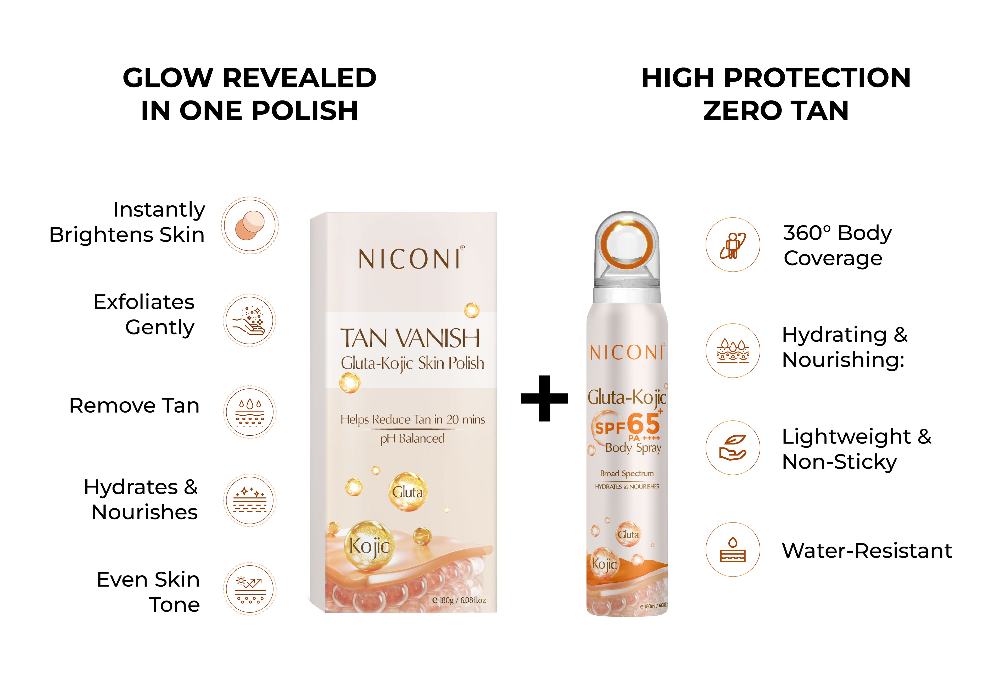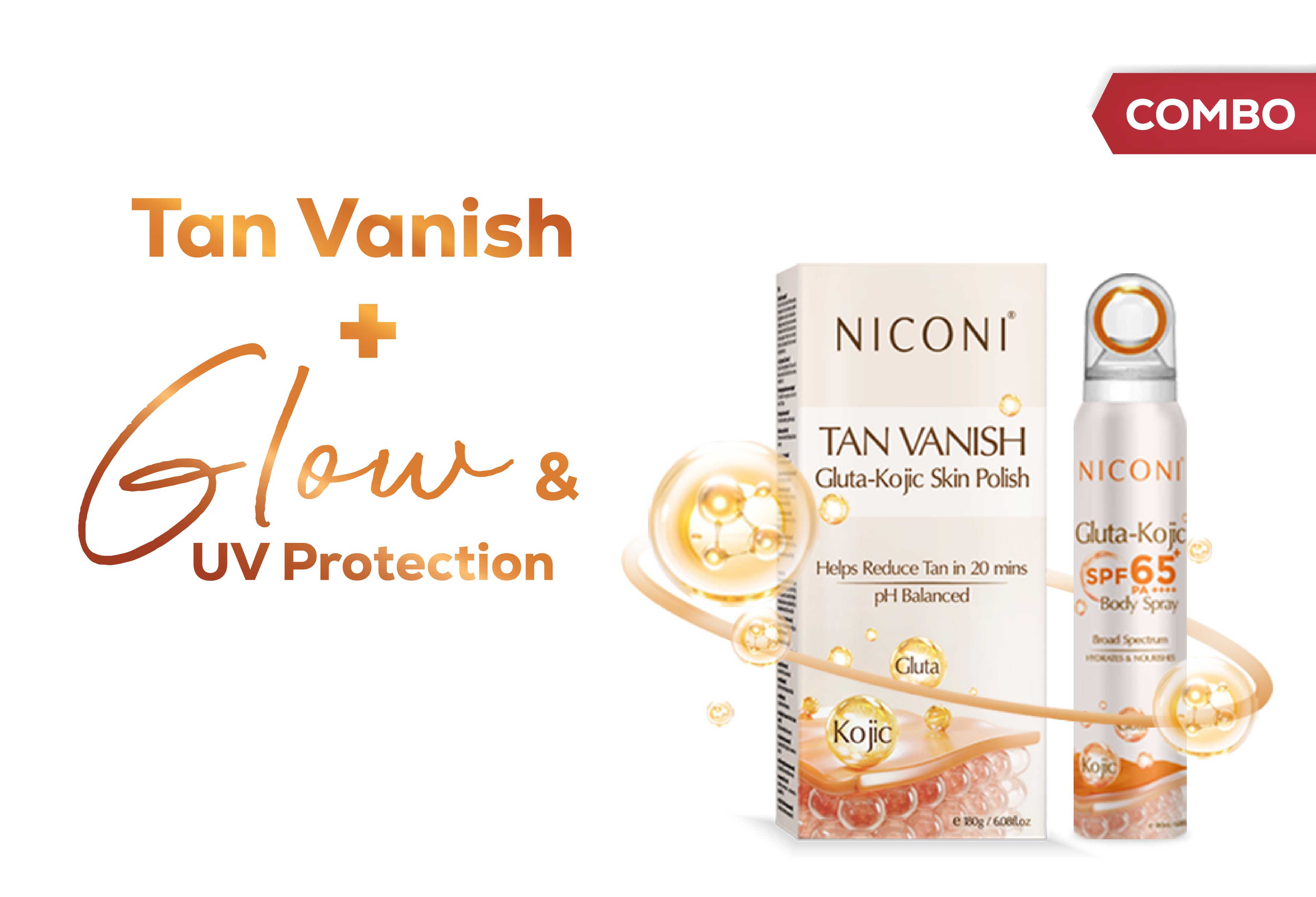 Niconi Tan Vanish Gluta-Kojic Skin Polish & Niconi Gluta-Kojic SPF 65+ PA++++ Body Spray Combo